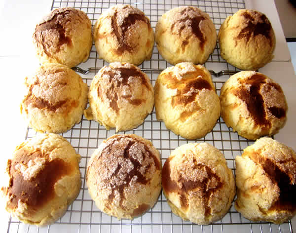 Traditional Conchas are made from an enriched dough made with egg and butter, and topped with a white or brown sugar paste before being baked.